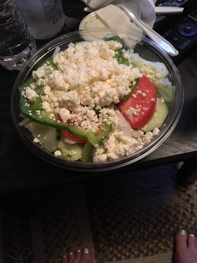 Iceberg lettuce, cucumber, onions ,peppers, tomato and feta cheese